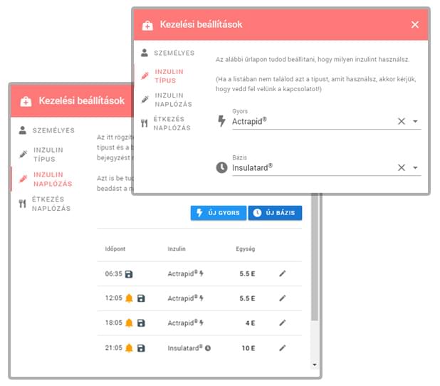 Ha előre megadod, hogy milyen inzulinokat használsz, akkor később a naplóban történő rögzítéskor is már a beállított fajtákat ajánla fel a rendszer. A beállítás részét képezheti a következő bekezdésben tárgyalt inzulin naplózás. Ehhez is már a beállított típusok kerülnek felajánlásra.