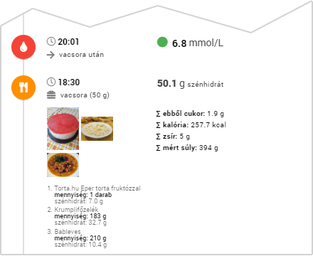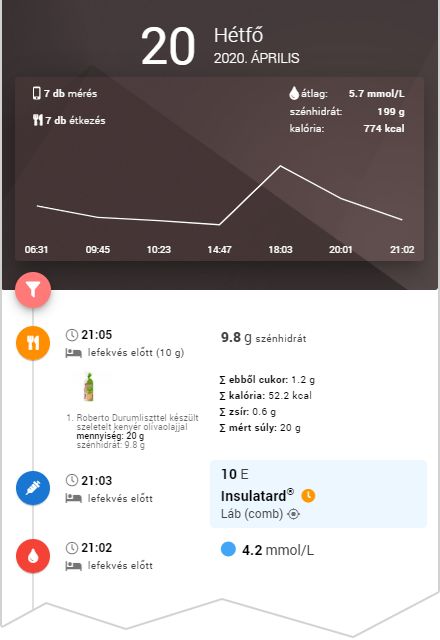 Asztali számítógép nézetben a képen látható módon egy vonalgrafikonnal jelenítjük meg az adott napon mért vércukorértekeidet. Ez mellett összesített adatok is szerepelnek itt. Egy-egy napi tevékenység esetén látszik a mért vércukor érték az időpont a beadott inzulin mennyisége és az elfogyasztott étel(ek) szénhidrát és tápanyagtartalma.