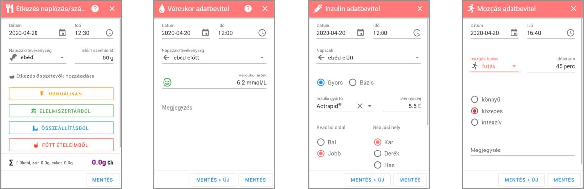 A különböző típusú adatokhoz külön beviteli űrlapokat (étkezés, vércukor, inzulin vagy mozgás) tudsz használni, amelyeket úgy készítettünk el, hogy az számodra a legfelhasználóbarátabb módon illeszkedjn a mindennapjaidba.